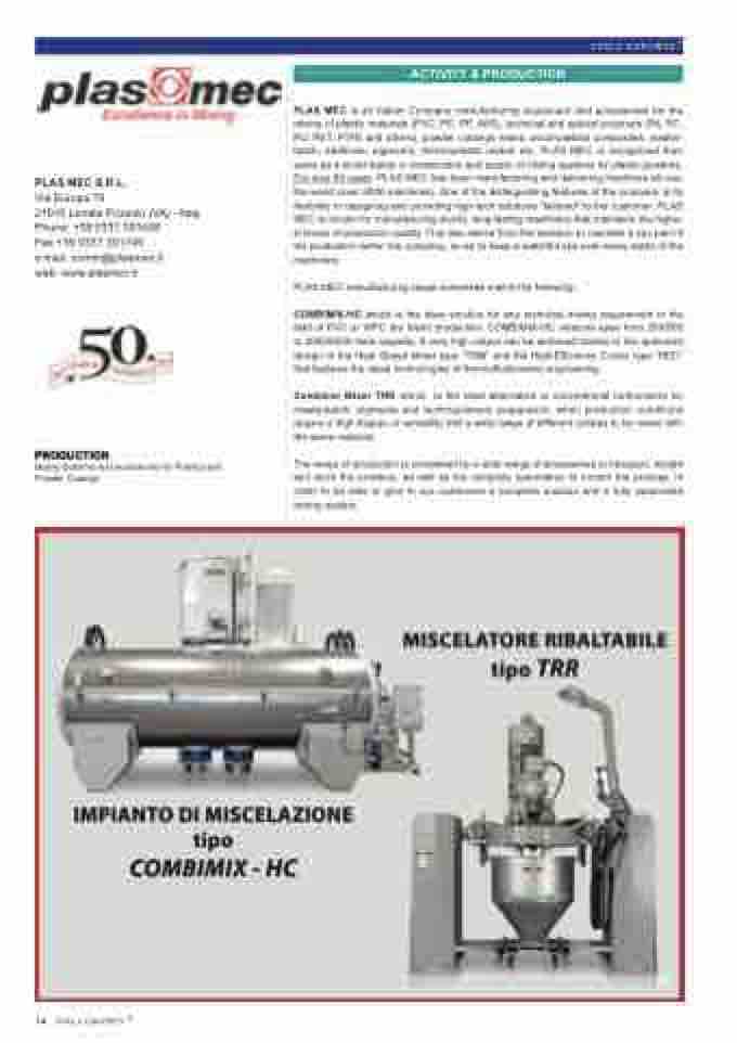 PLAS MEC is an Italian Company manufacturing equipment and accessories for the mixing of plastic materials (PVC, PE, PP, ABS), technical and special polymers (PA, PC, PU, PET, PTFE and others), powder coatings resins, wood-plastics composites, master- batch, additives, pigments, thermoplastic rubber etc. PLAS MEC is recognized from years as a world leader in construction and supply of mixing systems for plastic powders. For over 50 years PLAS MEC has been manufacturing and delivering machines all over the world (over 6000 machines). One of the distinguishing features of the company is its flexibility in designing and providing high-tech solutions "tailored" to the customer. PLAS MEC is known for manufacturing sturdy, long-lasting machinery that maintains the highe- st levels of production quality. This also stems from the decision to maintain a key part of the production within the company, so as to keep a watchful eye over every detail of the machinery.