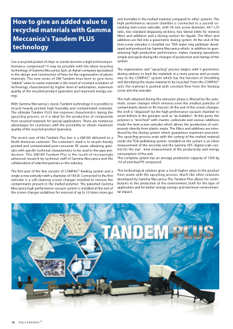 Can a recycled packet of chips or snacks become a high technical per- formance component? It may be possible with the latest recycling technology of Gamma Meccanica SpA, an Italian company specialized in the design and construction of lines for the regeneration of plastic materials. The new series of GM Tandem lines born to give more "added" value to waste materials is the result of constant evolution of technology characterized by higher level of automation, maximum quality of the recycled product (granules) and improved energy sav- ings.