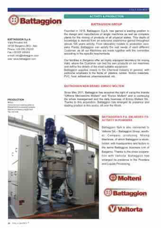 Battaggion SpA is also connected to Valtorta SrL - Battaggion Group, anoth- er Company producing Mixing Machines, of which Battaggion is stock- holder, with headquarters and factory in the same Battaggion business unit of Bergamo. Thanks to the close coopera- tion with Valtorta, Battaggion has enlarged its presence in the Powders and Liquids Processing.