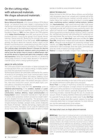 Biesse Advanced Materials is the business division of the Biesse Group - an Industrial Group and a leader in technology for the machining of wood, glass, stone, metal and technological materi- als - that focuses on the machining of advanced materials, com- posites and thermoformed materials. The Group, which was founded in Pesaro in 1969, has been listed in the STAR segment of the Italian Stock Exchange since 2001 and consists of 4 main business divisions covering the group's four brands: Biesse, Intermac, Diamut and HSD. Backed by the strength and experi- ence of a major industrial Group that boasts 4,000 employees globally, the Biesse advanced materials division stands out for Research and Development, a dedicated technical office and the service and commercial presence provided by 39 branch offices. The cutting-edge innovation Biesse is known for derives directly from the high-tech solutions used in its products, as well as from the Group's drive to invest in skilled human capi- tal and the desire to expand and add to the company's range and experience. Biesse has focused its attention on developing cutting edge solutions to meet market demand in the advance materials sector, which is seeing significant growth.